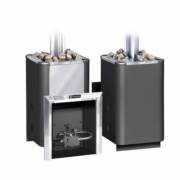 В комплекте печи идет газовая горелка с автоматикой УГ-САБК-АБ-20-1 (20 кВт) с датчиком температуры, энергонезависимым пьезорозжигом и системой безопасности, которая отключит подачу газа при затухании огня или отсутствия тяги. Уралочку 20-Н можно топить и дровами, для этого в комплекте есть дверца, которая устанавливается вместо горелки.