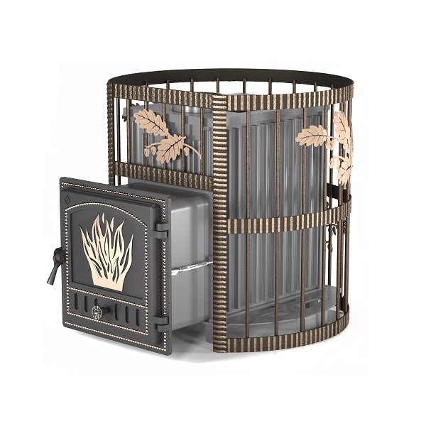 Чугунная банная печь Эверест 24 в кованной сетке. Большая мощность, эстетичный внешний вид, высокая теплоёмкость, вместительная каменка – вот ключевые отличия сборной чугунной печи Эверест 24. Печь рассчитана на объём парного отделения от 15 до 25 кубических метров. В каменку умещается 20-25 килограммов камней крупной фракции. Сетка сделана по комбинированной технологии, с использованием стального прутка и кованой стальной ленты. Декоративные элементы придают сетке элегантный внешний вид и хорошо вписываются в тематический банный дизайн. К основанию печи крепятся фасонные стальные детали, образующие поверхность для укладки камней. Сетка предназначена для обустройства открытой каменки, повышения теплоёмкости печи, выравнивания скорости нагрева парной. Наполнение сетки камнями помогает защитить парильщиков от жёсткого инфракрасного излучения, возникающего при нагреве металлической поверхности печи.