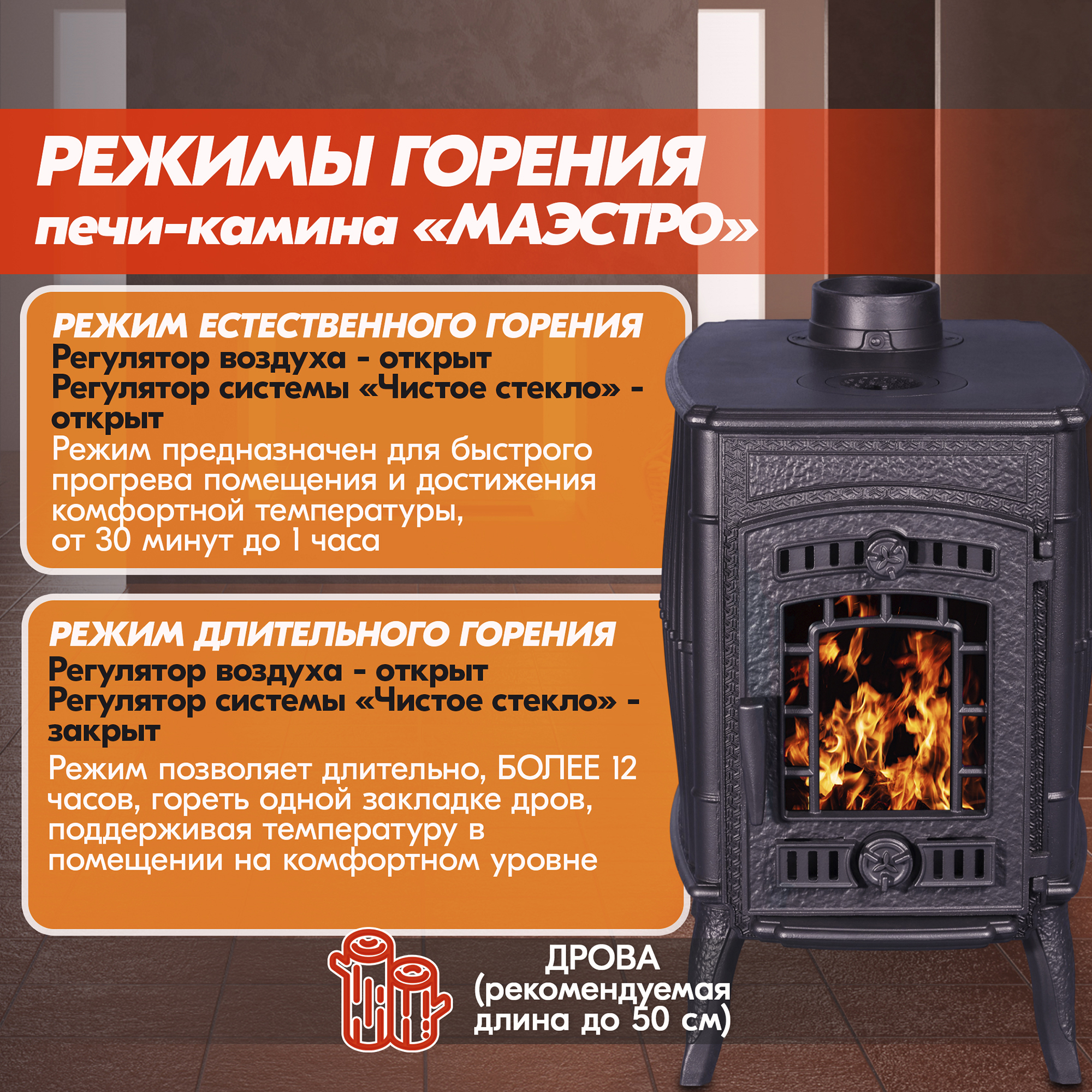 После достижения комфортной температуры рекомендуем переводить печь-камин в режим длительного горения.