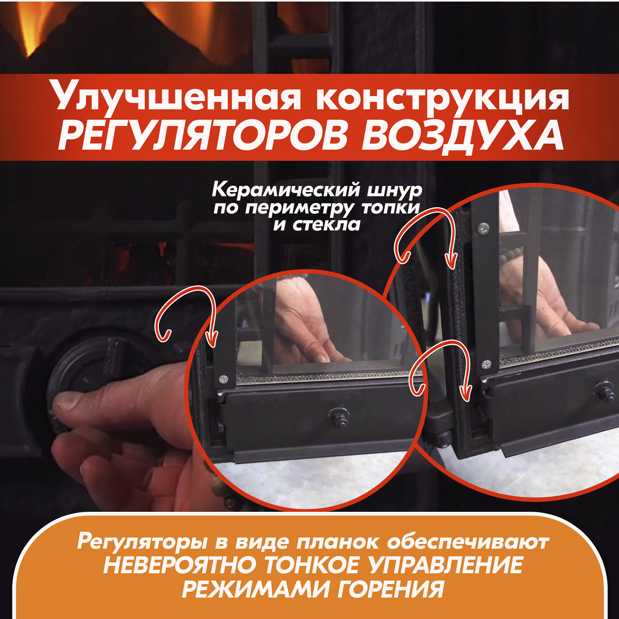В зависимости от положения регуляторов можно добиться нужного режима горения и чистоты стекла, а благодаря прозрачному стеклу можно проконтролировать, как изменилась интенсивность горения.