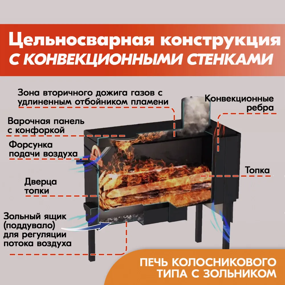 Воздушные потоки, входящие через зольник и колосниковую решетку, обеспечивают необходимый для горения топлива кислород.