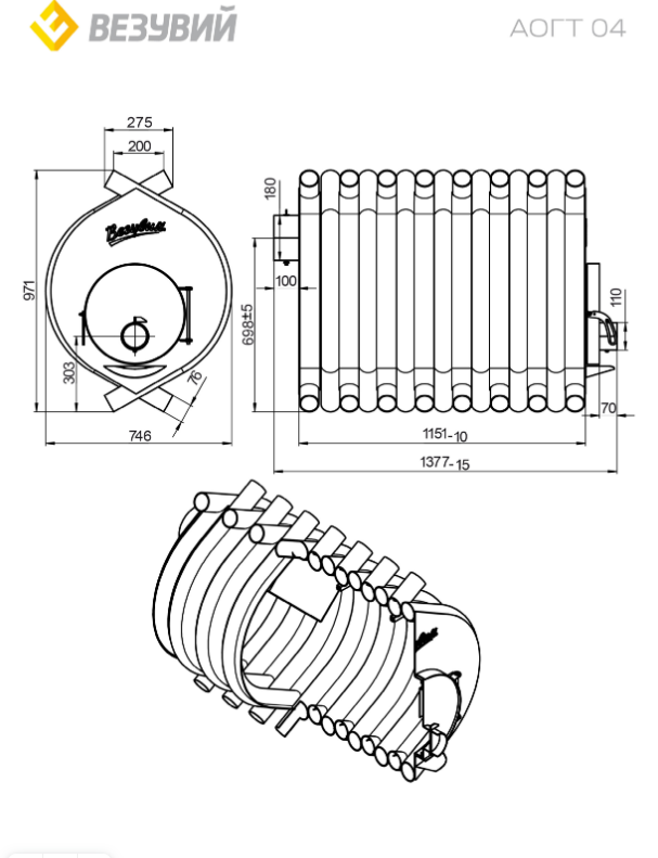 Печь отопительная ВЕЗУВИЙ АОГТ 04 предназначена для обогрева бытовых нежилых и промышленных помещений. Печь рассчитана на обогрев помещений объёмом 1000 кубических метров.
